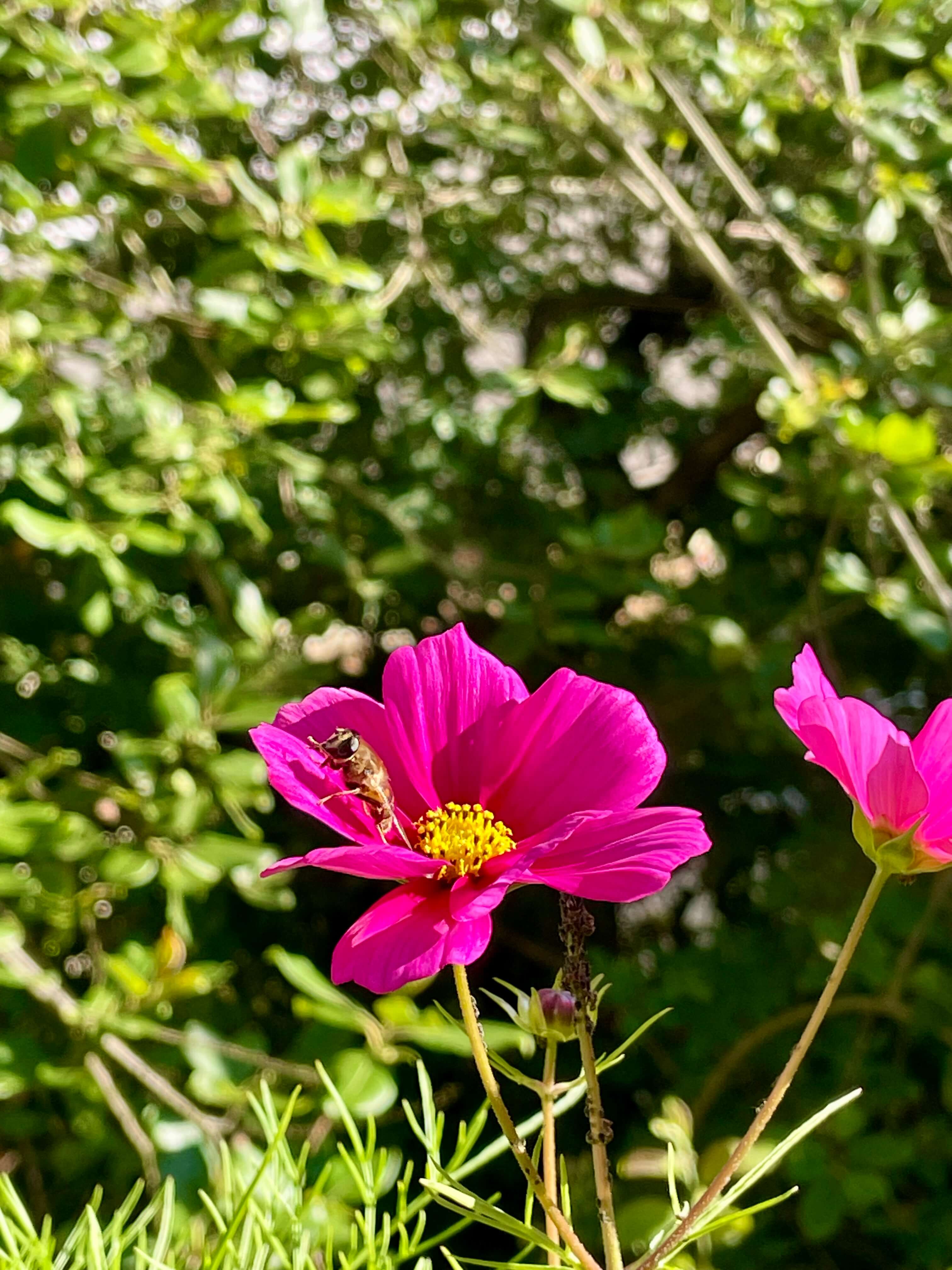 Eine Mistbiene hat die Sonne auf dem Schmuckkörbchen am Geländer abgepasst (links). Pfirsichblättrige Glockenblume Wilde Malve und Rote Lichtnelke erblühen auch ohne Sonne (rechts).