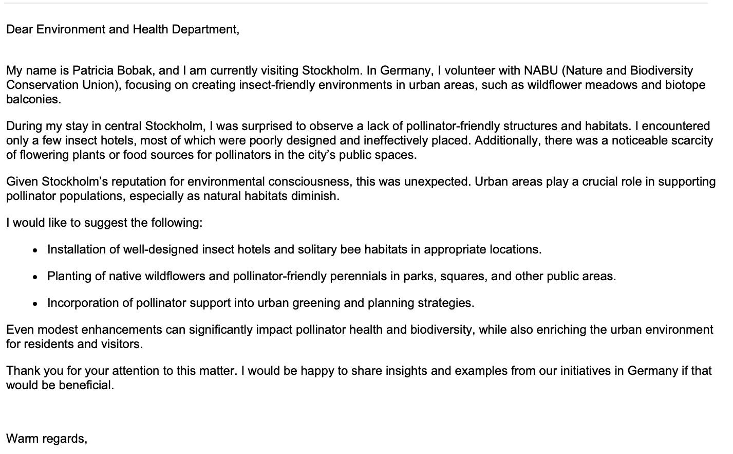 - Direkt E-Mails schreiben: Auch persönliche Nachrichten an lokale Behörden oder sonstige verantwortliche Stellen können Veränderungen anstoßen. Mein Artikel zu meinen E-Mails in Stockholm zu schlechten Wildbienennisthilfen ist hier ein gutes Beispiel, aber tatsächlich habe ich schon des Öfteren E-Mails an Behörden oder verschiedene Stellen geschrieben, etwa wegen der Bewässerung von Stadtbäumen in Zeiten der Trockenheit oder wegen einer nicht nachhaltiger Verpackungswahl in einem hochfrequentierten Museum. Nicht immer kommt eine Antwort zurück (und manchmal ist sie absurd!), aber in einigen Fällen setzt eine solche Nachricht einen wichtigen Impuls, der unter Umständen zu Veränderungen führen kann.